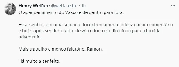 Ele criticou a distribuição desigual de ingressos e afirmou que os vascaínos teriam preenchido todo o seu lado do estádio se tivessem acesso a 50% da capacidade total. “Me surpreendeu a presença tão pequena de pessoas em um clássico tão importante do Rio. Não sei o motivo, não posso dizer. É lamentável porque é um espetáculo entre dois times com grandes torcidas, com muitos fãs. O Vasco poderia ter ocupado tudo.”