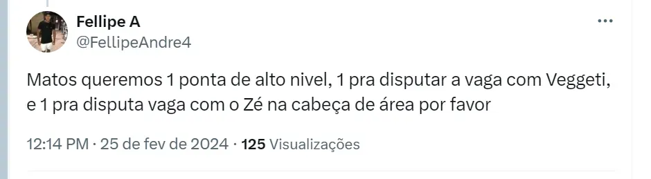 Os torcedores do Gigante da Colina pedem para Mattos contratar um ponta para ser titular e um centroavante para disputar posição com Pablo Vegetti. O ‘Pirata’ tem 35 anos e está sobrecarregado, já que não tem outro atleta para fazer a função.