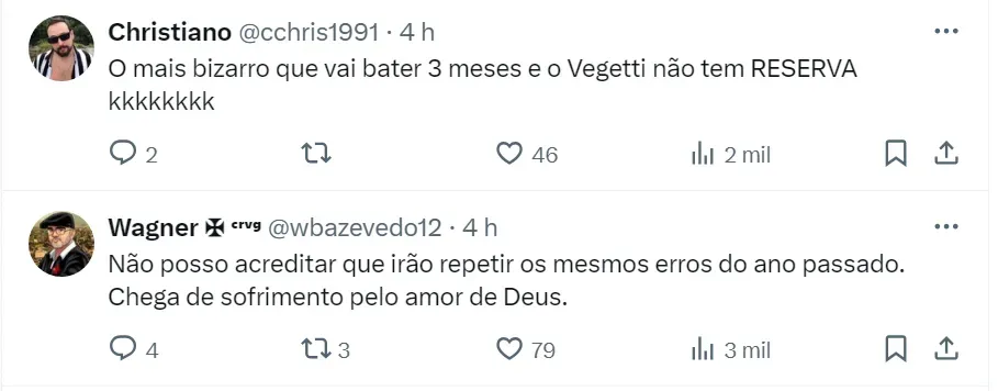 Mas a torcida do Gigante da Colina vê com preocupação o começo da temporada e acredita que o time precise de mais reforços. Com isso, os vascaínos estão cobrando o diretor de futebol de futebol Alexandre Mattos.