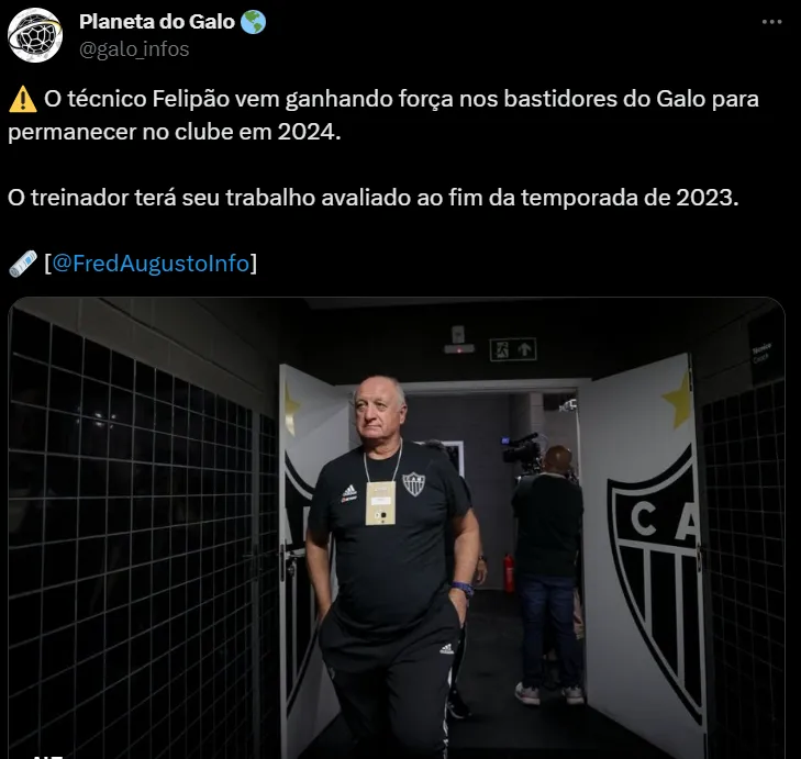 Conforme informações do jornalista Fred Augusto, a chance de Scolari continuar no Galo em 2024 está crescendo. Antes perseguido pela sombra da demissão, o comandante de 74 anos parece estar caindo na graça do elenco atleticano. No entanto, a ideia é que seu trabalho seja avaliado no final deste ano, para confirmar ou não, sua continuidade em solo mineiro.