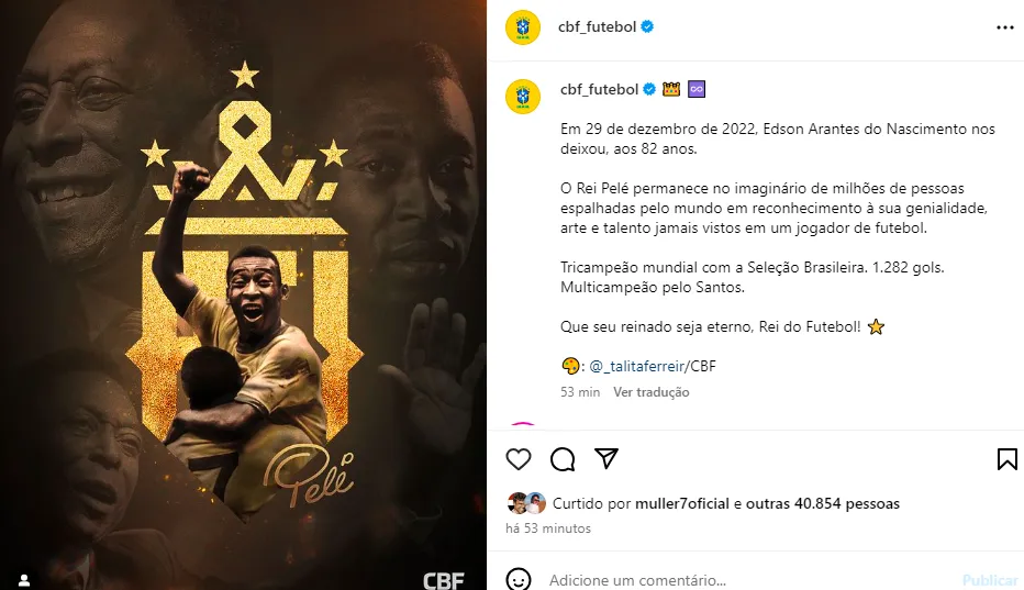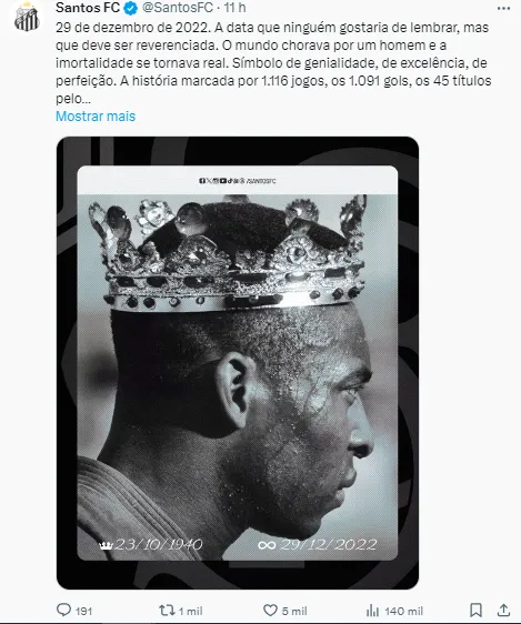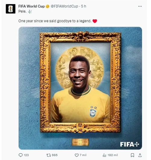 Por fim, a FIFA. A maior entidade do futebol foi mais sucinta que a CBF e a Conmebol, mas não deixou de deixar registrada sua homenagem: “Pelé. Um ano desde que nos despedimos de uma lenda”, dizia o texto, seguido de um tweet com algumas jogadas dele.
