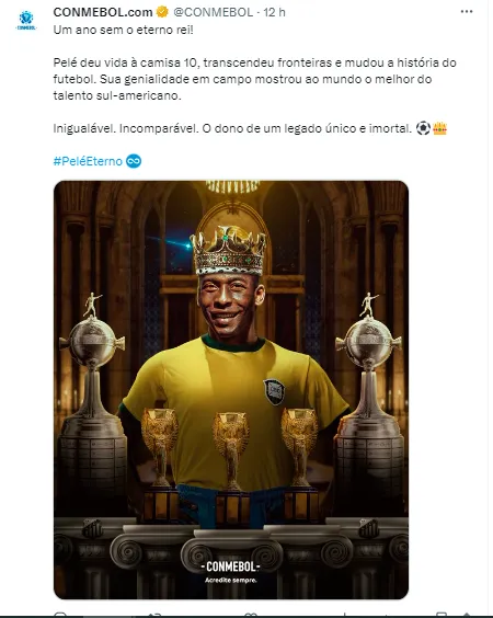 Agora, quem acha que as homenagens se limitaram ao Brasil, se engana. O perfil da Conmebol se manifestou: “Pelé deu vida à camisa 10, transcendeu fronteiras e mudou a história do futebol. Sua genialidade em campo mostrou ao mundo o melhor do talento sul-americano”, publicou o perfil oficial no Twitter.