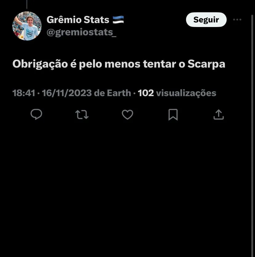 Na web, a torcida gremista pediu para Guerra fazer um esforço e trazê-lo em 2024: (SIC) “2 nomes que se viessem já dava outra cara ao Grêmio de 2024: A. Sandro para a lateral esquerda G. Scarpa para o meio campo Para a lateral esquerda penso que o Grêmio tem algumas investidas no mercado”; “Esse jogando com o Suárez”; “Obrigação tentar o Scarpa”, foram os comentários.