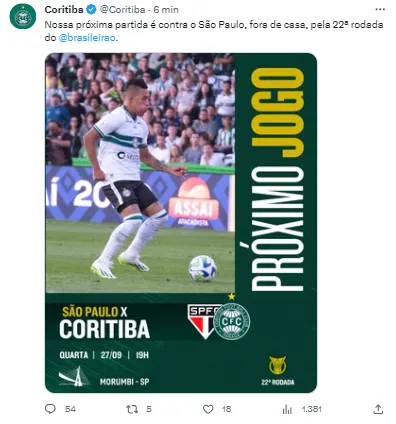 O Coritiba está passando por um momento bastante complicado na temporada. A equipe é lanterna do Campeonato Brasileiro com apenas 14 pontos, sendo 11 de diferença para o primeiro fora da zona de rebaixamento, o Bahia, e vem de uma sequência dura de sete derrotas, após goleada por 5 a 1 sofrida para o Vasco, na última quinta-feira (21), em São Januário, pela 24ª rodada.