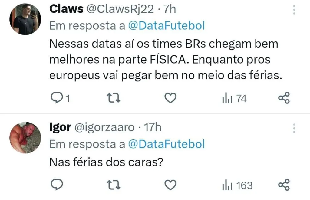 A Fifpro afirmou que a FIFA ignora a opinião dos jogadores. “O processo da Fifa para discutir a questão global do calendário de jogos não exclui somente os sindicatos de jogadores, mas também ignora a opinião dos jogadores quando se trata da saúde, do bem-estar e do desempenho deles”, afirmou a Fifpro.