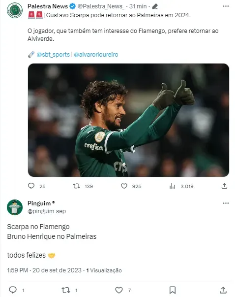 Segundo informação do jornalista Álvaro Loureiro, do SBT, Gustavo Scarpa pode retornar ao Palmeiras em 2024. A notícia afetaria também os bastidores do Flamengo, que procurou o craque recentemente e que agora corre sério risco de perder a disputa pelo atleta para o alviverde. O meia está atualmente no Olympiacos, emprestado pelo Nottingham Forest e sempre teve o sonho de jogar a Champions League, o que pode acabar não acontecendo.