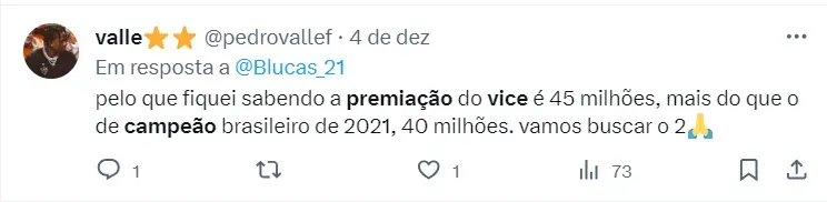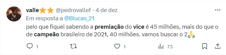 Mas, há outro motivo que deixará o torcedor Atleticano orgulhoso mesmo se o time for vice: a grana que o Galão da Massa ganhará como premiação. Hoje, a premiação para o segundo colocado do Brasileiro está avaliada em R$ 45 milhões.