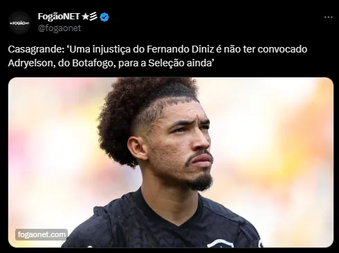 O colunista defendeu a convocação do defensor para a Seleção Brasileira, considerando-a uma injustiça que ainda não tenha acontecido. “Preciso destacar que a dupla de zaga do Botafogo formada por Adryelson e Victor Cuesta é formidável. Ganham todas pelo alto, são ótimos quando o adversário tentar entrar tocando e, quando precisam sair da área para buscar o atacante, chegam junto mesmo. Não são violentos, mas mostram que ali ninguém vai brincar. Uma injustiça do Fernando Diniz é não ter convocado o Adryelson para a Seleção ainda”, escreveu Casagrande.