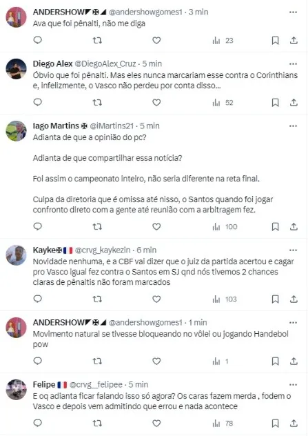 No entanto, especialmente nas redes sociais, houve uma reclamação dos torcedores envolvendo um lance: Gabriel Moscardo, autor do 3º gol corinthiano, teria tocado com o cotovelo na bola dentro da área.