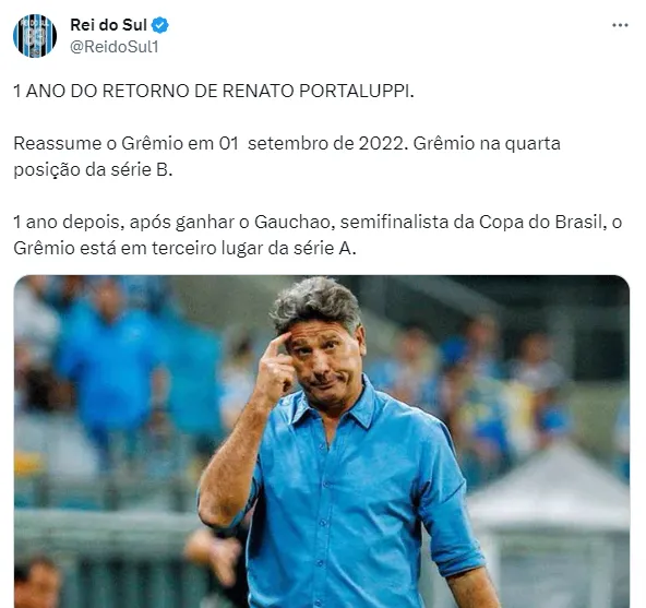 Falando no técnico Renato, nesta sexta-feira (1), ele completa um ano desde que assumiu o comando do Grêmio lá em 2022, na Série B do Brasileirão. De lá para cá foram muitos feitos, como a conquista ao acesso de volta à Série A, ser campeão no Gauchão, ser semifinalista na Copa do Brasil, e estar entre os primeiros colocados do Brasileirão.