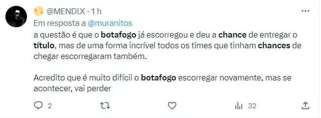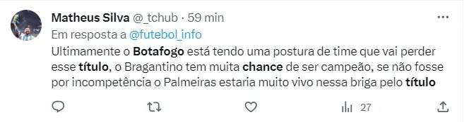 Na sequência vem o Bragantino, com 9.8%, e o Flamengo, com 3.3% de chances. Apesar de ainda liderar o campeonato, o Botafogo começa a prestar mais atenção no retrovisor pela quantidade de pontos que os rivais vão tirando nas últimas rodadas da competição. A ideia do Glorioso é somar o máximo de pontos possível para depender só de si ao final do Brasileirão.