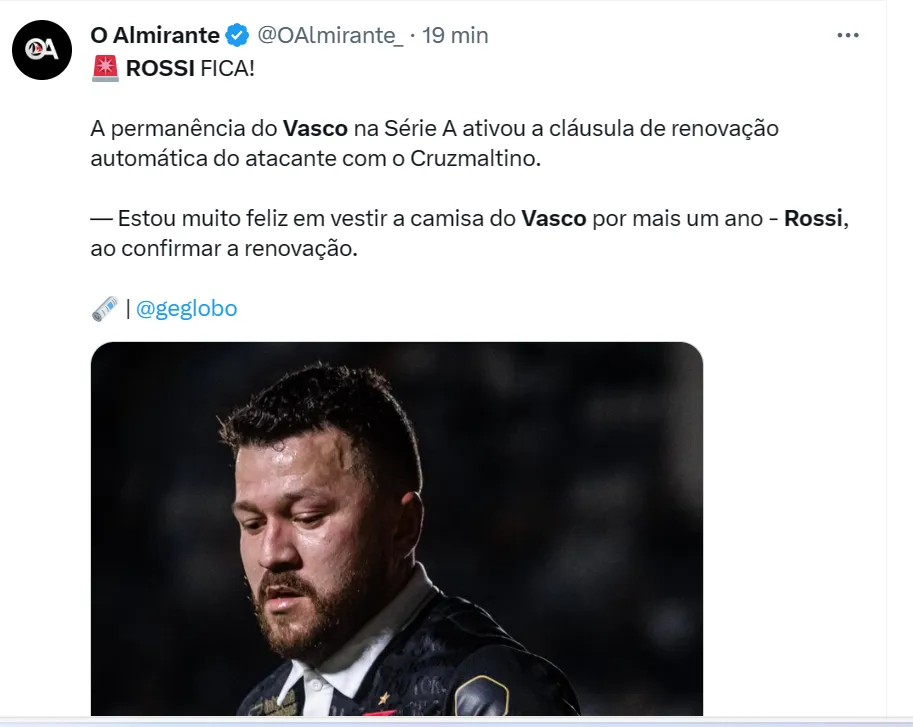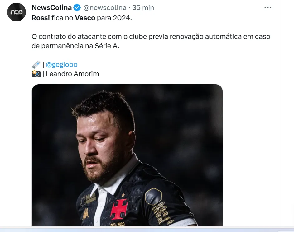 De férias em Santarém (PA), o atacante confirmou que vai ficar no Vasco em 2024. Ao Globo Esporte, Rossi contou que o contrato com o Clube seria prorrogado automaticamente com a permanência na Série A.