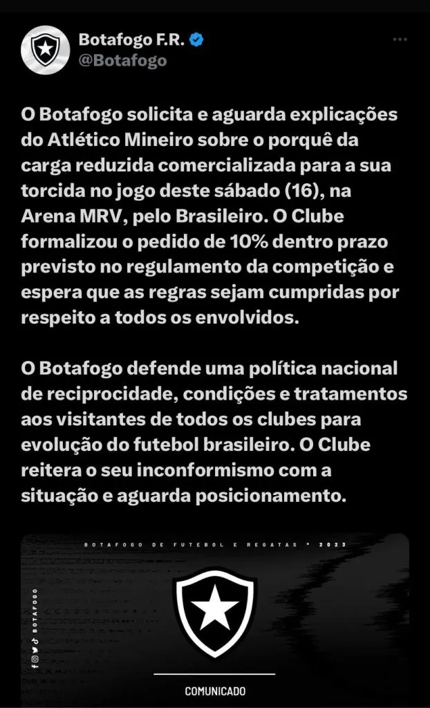 “O Clube formalizou o pedido de 10% dentro prazo previsto no regulamento da competição e espera que as regras sejam cumpridas por respeito a todos os envolvidos. O Botafogo defende uma política nacional de reciprocidade, condições e tratamentos aos visitantes de todos os clubes para evolução do futebol brasileiro. O Clube reitera o seu inconformismo com a situação e aguarda posicionamento”, disse a postagem