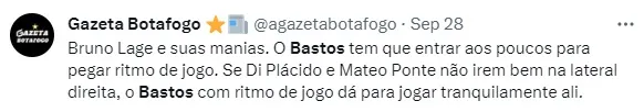 Bastos assinou contrato com o Botafogo até o final de 2024 e foi regularizado pouco antes do jogo contra o Flamengo, no início de setembro. No entanto, ele não foi relacionado para nenhuma partida até o momento, incluindo os confrontos contra Atlético-MG e Corinthians. Embora esteja à disposição do técnico Bruno Lage, o Botafogo tem optado por relacionar apenas um zagueiro para o banco de reservas, sendo Philipe Sampaio o substituto imediato da posição.