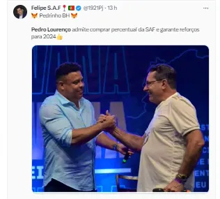 Pedrinho BH expôs que Ronaldo está aberto a uma negociação e as conversas já vem acontecendo. “Quem sabe? Talvez sim (compre ações da SAF). Ronaldo está sempre de portas abertas, fala nesse assunto, estamos sempre conversando. Eu quero o bem do Cruzeiro, quero a torcida feliz”.