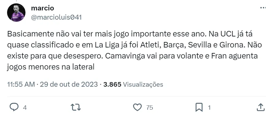 Como o tempo de recuperação da lesão do volante é de dois meses, a tendência é ele só voltar aos gramados em 2024. Com isso, Ancelotti vai ter que mudar a escalação da equipe neste período.