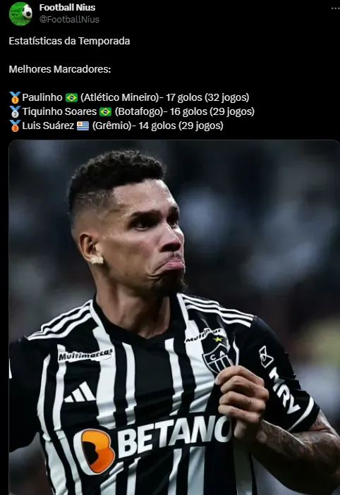 Em sua primeira temporada pelo Atlético-MG, Paulinho vive uma fase excepcional. O atacante é o artilheiro isolado da competição, com impressionantes 17 gols em 32 jogos.