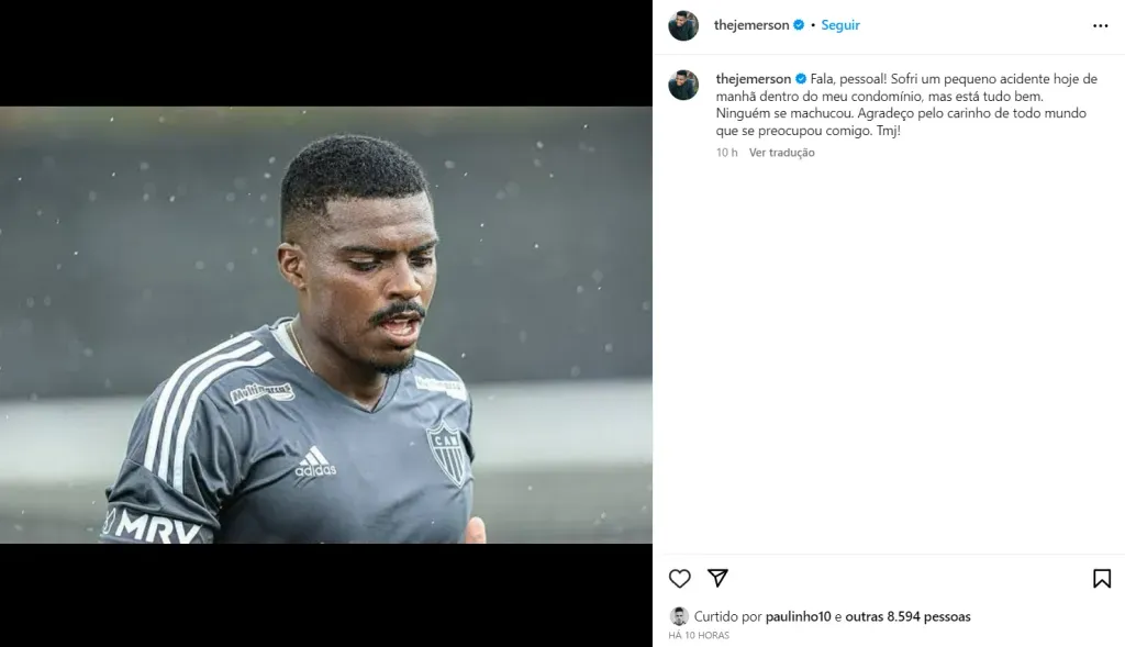 Além de Jemerson, participaram da conversa o técnico do Atlético Mineiro, Felipão, o gerente de futebol do clube, Victor, e o diretor executivo do clube, Rodrigo Caetano. A entidade, porém, não informou se a infração do atleta que resultou em penalidade envolve apenas o acidente automobilístico, ou se o fato de ter acontecido às 5h00 da manhã pode ter sido um agravante.