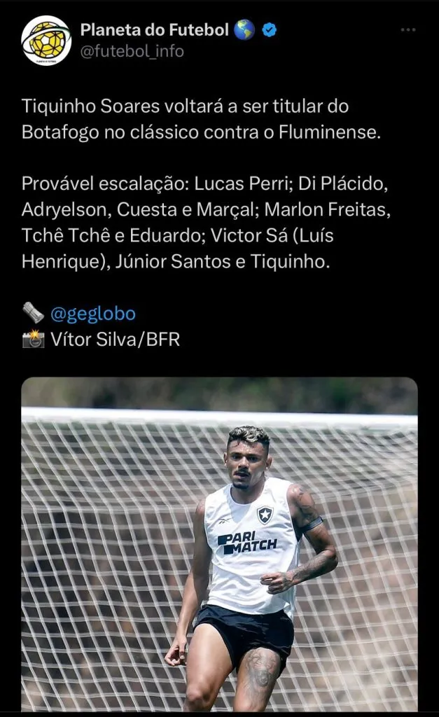 O camisa 9 é o artilheiro da Série A do Campeonato Brasileiro e foi o responsável por empatar o último jogo e evitar que o Glorioso chegasse na sua quarta derrota seguida no Brasileirão. O novo treinador não quer repetir o mesmo erro de Bruno Lage e irá escalar o craque do Botafogo como titular diante do Fluminense.