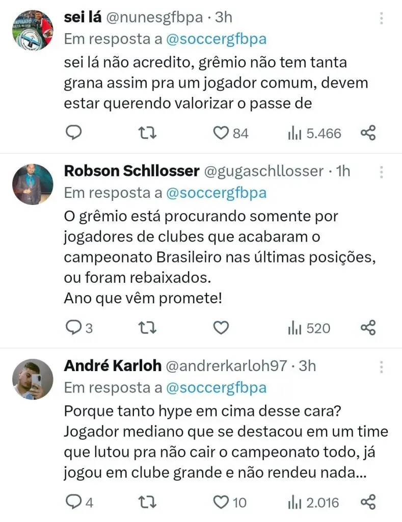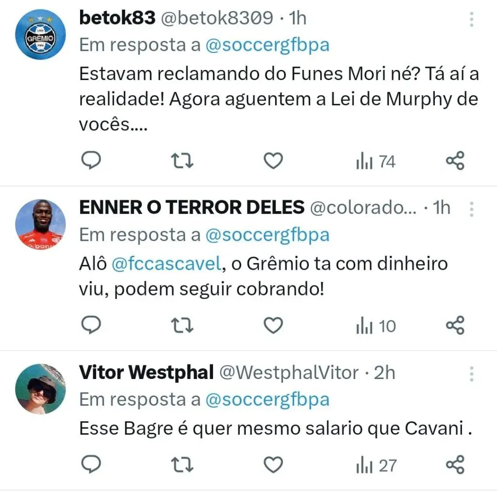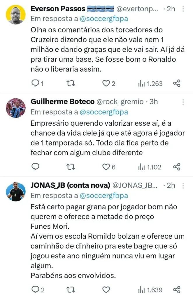 “Está certo pagar grana por jogador bom não querem e oferece a metade do preço Funes Mori. Aí vem os escola Romildo Bolzan e oferece um caminhão de dinheiro pra este bagre que só jogou este ano ninguém nunca viu em lugar algum. Parabéns aos envolvidos.”, criticou outro.