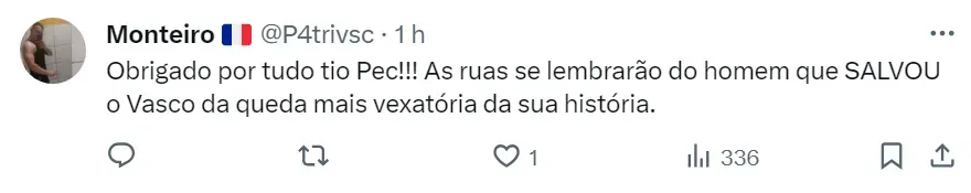 “Obrigado por tudo tio Pec!!! As ruas se lembrarão do homem que SALVOU o Vasco da queda mais vexatória da sua história”, escreveu um torcedor do Vasco na web.