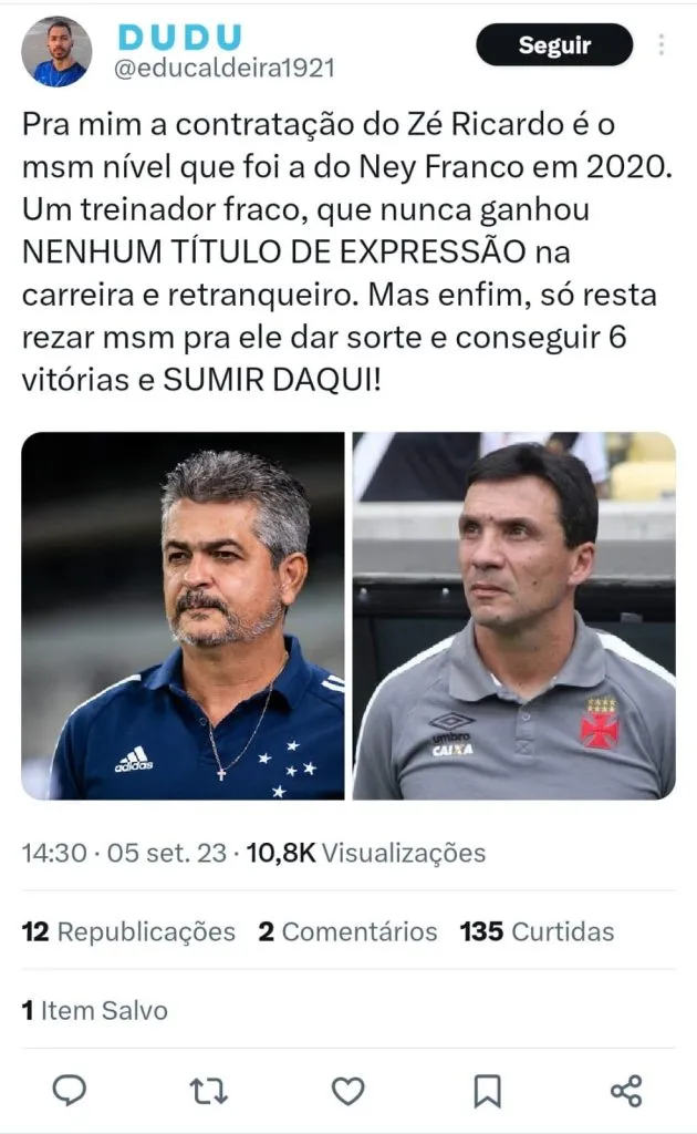 Zé Ricardo é oficialmente o novo técnico do Cruzeiro. O treinador foi apresentado nesta quarta-feira (6), na Toca da Raposa 2. Mas antes mesmo de iniciar os trabalhos com a equipe, Zé Ricardo já precisou encarar um desafio extra. O novo comandante não foi bem aceito pela torcida.