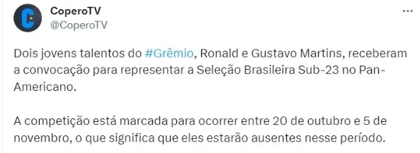 Vale lembrar que as competições nacionais não serão interrompidas para a realização dos jogos Pan-Americanos. Os dois jogadores estão sendo utilizados pelo técnico Renato Portaluppi nas últimas partidas. Inclusive, a dupla esteve no confronto diante do Palmeiras, na vitória do Imortal, por 1 a 0, na Arena, com gol de João Pedro.