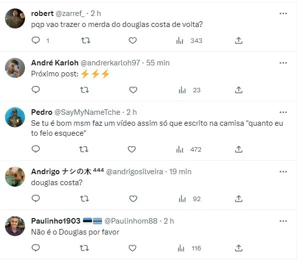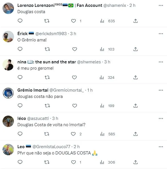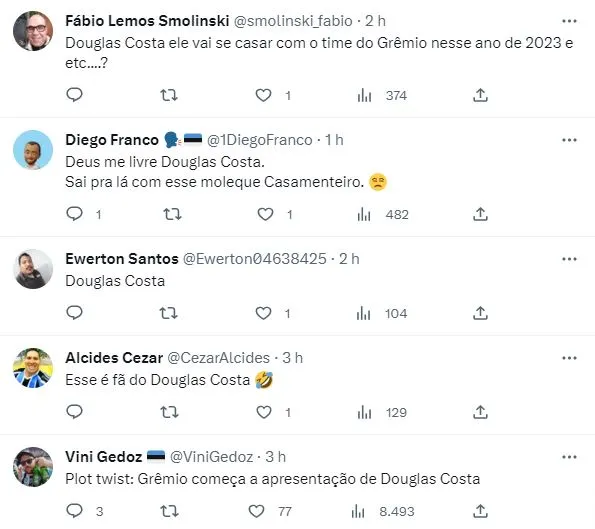 Os comentários foram da zueria ao descontentamento sobre um possível retorno: “Plot twist: Grêmio começa a apresentação de Douglas Costa”, brincou um torcedor. “Amanhã no seu melhor jornal: Douglas Costa no Grêmio? ENTENDA…”. “O Douglas Costa vai casar de novo? Eita como ama um casamento”, polemizou outro Tricolor. “Douglas Costa de volta no Imortal?”, comentou outro gremista. “Deus me livre Douglas Costa. Sai pra lá com esse moleque casamenteiro”, apontou um dos posts que rejeitam o jogador.