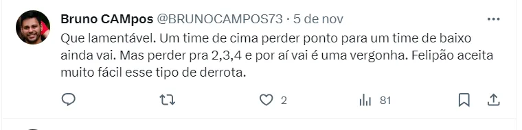 “Não vamos aceitar barca furada vestindo a camisa do nosso clube e nem comissão técnica covarde, medrosa e sem padrão de jogo. Classificar pra Libertadores 2024 é mais do que a obrigação de todos vocês”, concluiu.