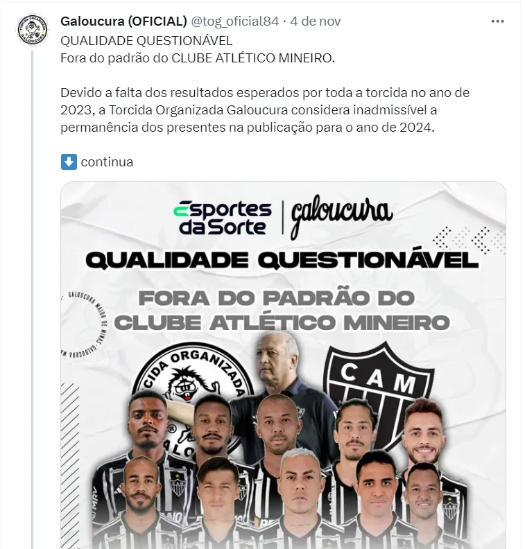 “Qualidade questionável. Fora do padrão do Clube Atlético-Mineiro. Devido à falta dos resultados esperados por toda a torcida no ano de 2023, a Torcida Organizada Galoucura considera inadmissível a permanência dos presentes na publicação para o ano de 2024”, iniciou.