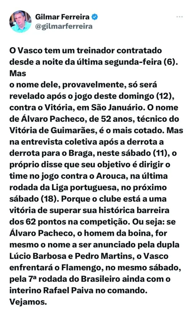 Em postagem feita no X (Twitter), o jornalista trouxe detalhes da contratação: “O Vasco tem um treinador contratado desde a noite da última segunda-feira (6). Mas o nome dele, provavelmente, só será revelado após o jogo deste domingo (12), contra o Vitória, em São Januário. O nome de Álvaro Pacheco, de 52 anos, técnico do Vitória de Guimarães, é o mais cotado”, disse.
