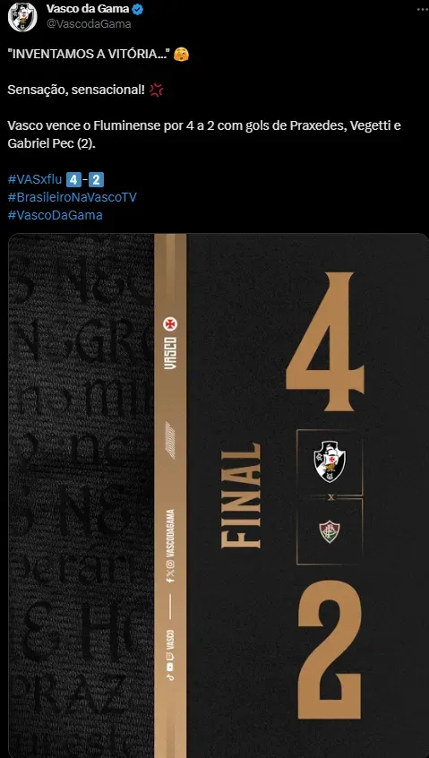 O Vasco ironizou o Fluminense e não perdeu tempo em celebrar sua vitória por 4×2 sobre o Fluminense neste sábado (16), durante a 23ª rodada do Campeonato Brasileiro. O clube cruzmaltino utilizou suas redes sociais para afrontar o rival tricolor, publicando a frase “Inventamos a vitória”, expressando sua satisfação com o resultado positivo. A atitude pode ser vista como precipitada, se contar com a caminhada um tanto quanto torta do time. O Vasco tem teto de vidro, e “tirar uma” assim, pode pesar lá na frente.