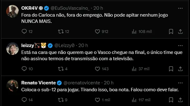 Após o apito final, jogadores do Vasco cobraram a atuação do grupo de arbitragem. Ainda no Maracanã, em entrevista para o Canal Goat, Vegetti comentou o que achou das decisões tomadas: