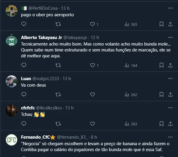 Vale destacar que o jogador chegou ao Coritiba no meio de 2022 e foi comprado em definitivo no meio do ano passado, já que pertencia ao Internacional, mesmo tendo sido revelado no Vasco da Gama.