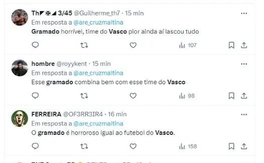 “Gramado péssimo do castelão, Fortaleza era pra pegar exemplo de equipes que tem estádio com gramado bom, como Vasco, Palmeiras, São Paulo, Santos, Flamengo“, escreveu um torcedor no X, antigo Twitter.