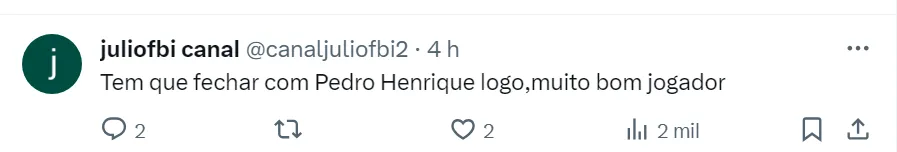 “Pedro Henrique muito perto de virar reforço. Pedro tem feito todo esforço para negociar sua saída com o Internacional. Deve chegar por empréstimo, com opção de compra”, completou o jornalista neste sábado (10).