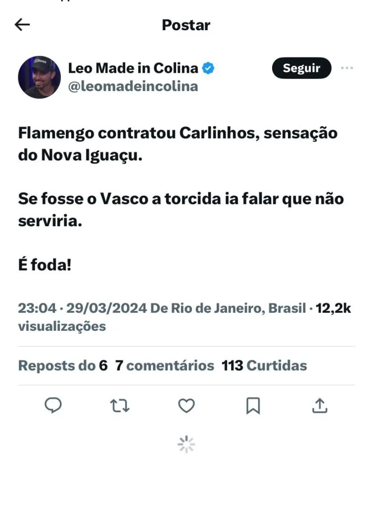 Alguns vascaínos lamentaram perder o atleta para o rival, outros nem tanto: (SIC) “O Vasco é muito incompetente de nem ter tentado o Carlinhos”; “Flamengo contratou Carlinhos, sensação do Nova Iguaçu. Se fosse o Vasco a torcida ia falar que não serviria”; “Carlinhos chega ao Flamengo para receber 30 bolas por jogo de Arrascaeta e cia, pra guardar um gol. Aqui no Vasco chegaria para ser um reserva passando fome na área e não contribuir com nada de diferente. Já achei desperdício trazer Clayton, vou chorar por Carlinhos?”, foram alguns comentários da torcida.