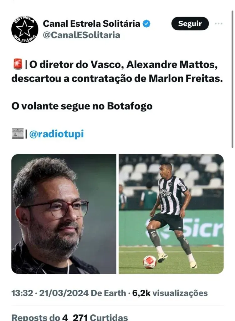 No meio disso tudo, uma nova situação envolvendo Marlon Freitas foi revelada. Atualmente no Botafogo, foi informado que o atleta interessava ao Gigante da Colina, algo que foi negado por Mattos na última semana.