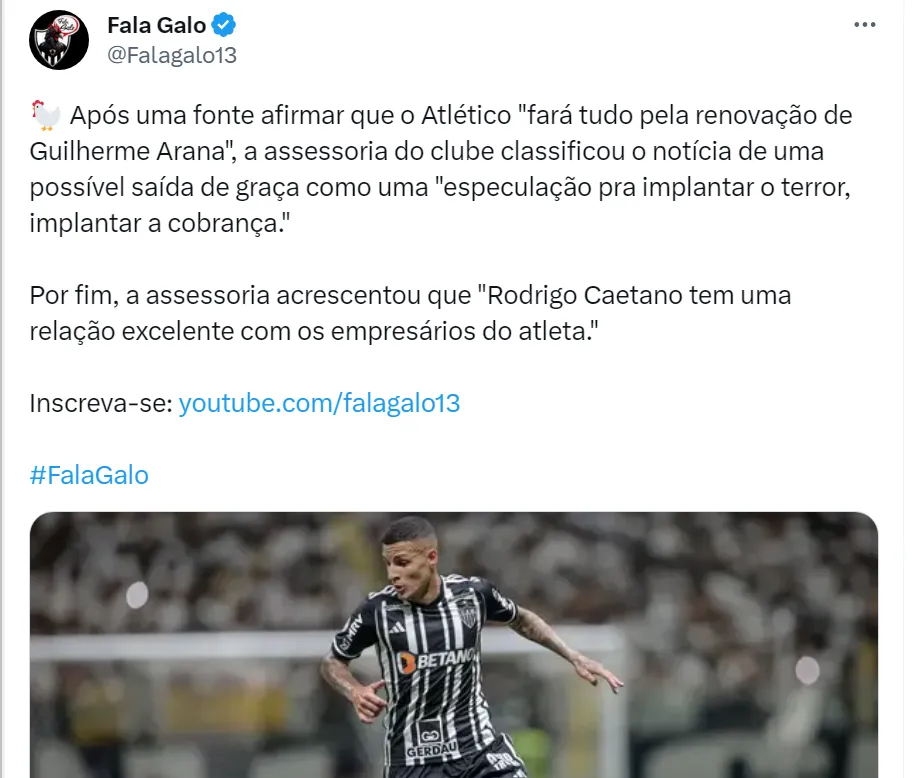 O time de Belo Horizonte não ficou calado e, em contato com o perfil Fala Galo, a assessoria do Atlético-MG afirmou que a notícia de uma possível saída de Guilherme Arana de graça do Clube Mineiro é uma “especulação pra implantar o terror, implantar a cobrança”. A assessoria ainda destacou que Rodrigo Caetano, diretor de futebol do Galo, “tem uma relação excelente com os empresários do atleta”.