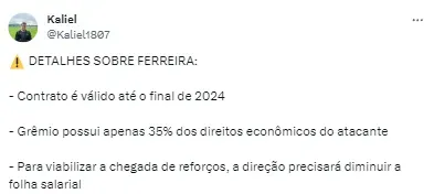 “O atacante Ferreira é um dos primeiros nomes na lista dos jogadores que o Grêmio pretende negociar em 2024. O entendimento interno é que a relação custo-benefício está no negativo, tendo em vista que o atleta recebe um alto salário”, apontou Kaliel.
