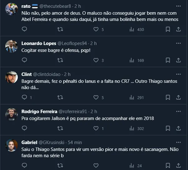 Posto isso, como o volante está na lista de observação do Grêmio para a próxima temporada e o tema vazou. Ou seja, diversos torcedores do Tricolor foram às redes sociais criticar o interesse no atleta.