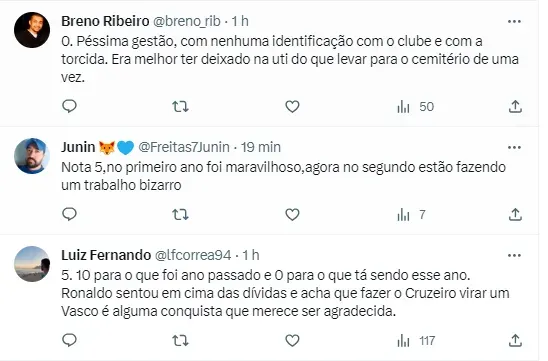 Em meio a isso, o sócio-proprietário do Cabuloso, Ronaldo Fenômeno, vem sendo muito criticado pelos torcedores. Muitos vem falando que o empresário vem fazendo pouco pelo time e que vem tomando decisões equivocadas nos bastidores. Situação muito diferente da campanha da equipe no ano passado, quando a Raposa foi campeã da Série B. Alguns chegaram, inclusive, a dizer que ele tinha “salvado” o Cruzeiro.