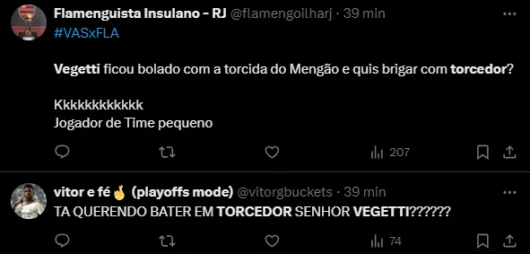 Vegetti não aguentou a provocação da mureta e quis barraco. Tadinho”, “Vegetti ficou bolado com a torcida do Mengão e quis brigar com torcedor? Kkkkkkkkkkkk” e “Vegetti foi tentar partir pra cima de um torcedor na ida pro intervalo e tomou um se liga do segurança kkkkkkkkkk”, foram os comentários.