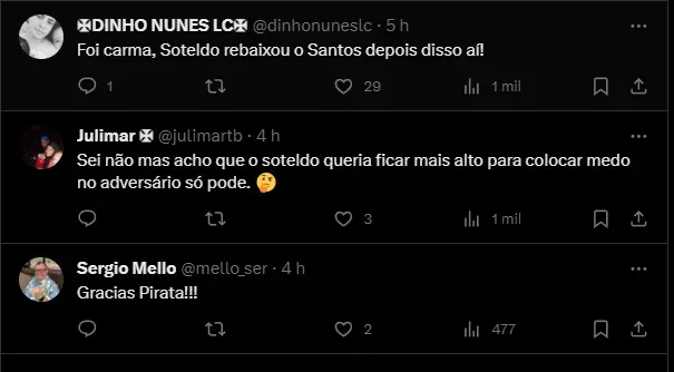 Rossi e Puma Rodríguez também publicaram fotos provocando Soteldo. Para os torcedores do Vasco, esse lance não será esquecido, novas provocações serão feitas, principalmente quando o Santos iniciar a Série B de 2024.