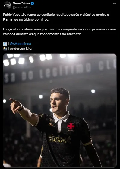 Segundo informações trazidas em primeira mão pelo portal Atenção Vascaínos, o experiente atacante argentino Vegetti, teria ficado revoltado e chegou no vestiário cobrando os seus companheiros de Clube.