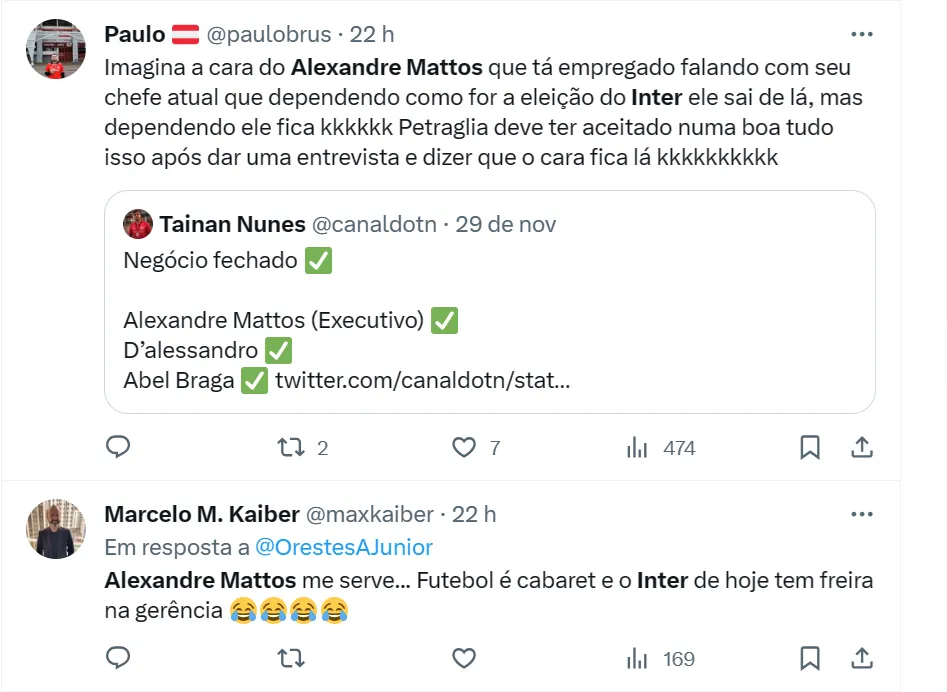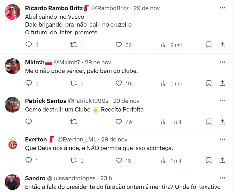 No Furacão, acumula o título paranaense de 2023 e foi vice-campeão da Libertadores no ano passado. São 11 títulos em sua carreira como dirigente de futebol. Até o fechamento da matéria, a assessoria de imprensa de Mattos não se pronunciou sobre a informação do lado colorado.
