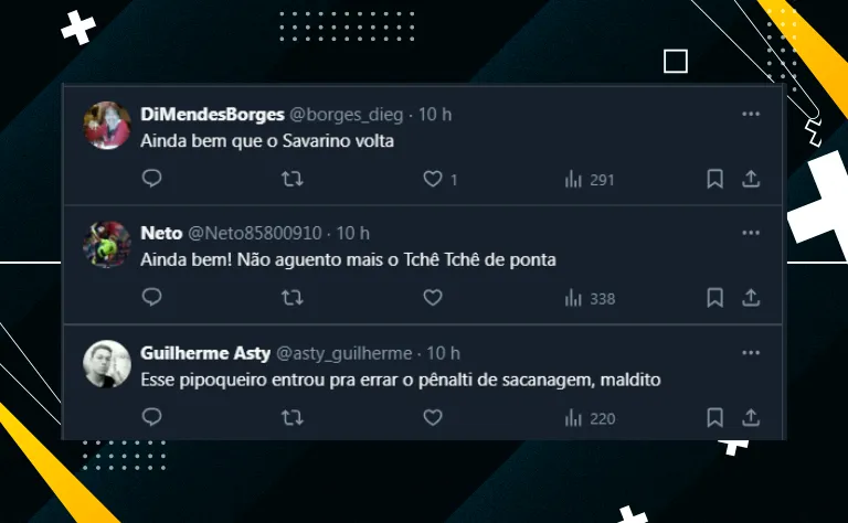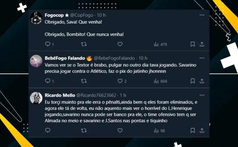 Nas redes sociais, vários alvinegros repercutiram o erro de Savarino e já pediram o jogador no time contra o Galo. De qualquer forma, a expectativa é que ele retorne diante do Vitória, na próxima quinta-feira (11).