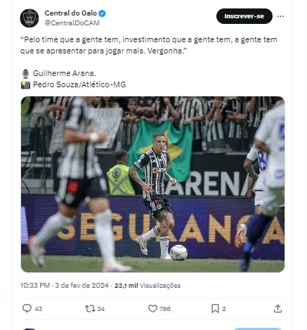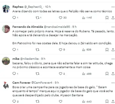 “Pelo time que a gente tem, investimento que a gente tem, a gente tem que se apresentar para jogar mais. Vergonha”, disse o camisa 13 logo após a saída do time de campo. Antes da partida, houve novidades sobre possíveis contratações do time mineiro.