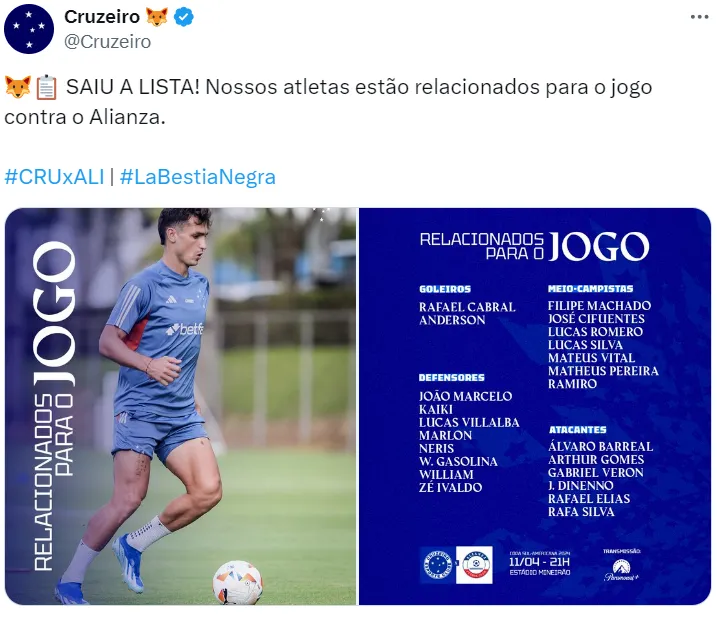 Uma das grandes surpresas do treinador foi a presença de Gabriel Veron na lista de relacionados do Cruzeiro. Esta é a primeira vez que o jogador, contratado nesta temporada, pode ser opção para a partida.