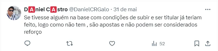 Durante entrevista à TV Galo, o dirigente explicou que não vai trazer reforços para a equipe e que vem trabalhando na busca por nomes pontuais. A intenção é buscar por jogadores que tenham condições de brigar por titularidade.